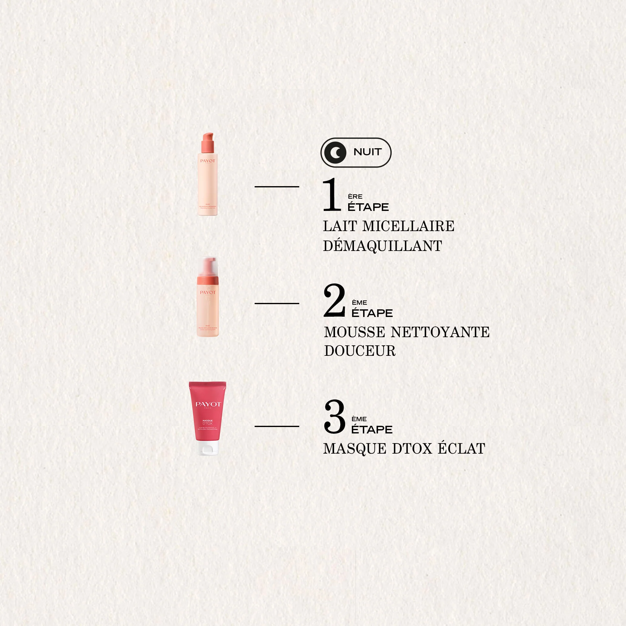 1 à 2 fois par semaine, appliquez en couche épaisse sur l’ensemble du visage, cou et décolleté démaquillés, en évitant le contour des yeux. Laissez poser 10 mn. Puis rincez à l’eau tiède. Tonifier. Continuez la routine de soin avec le soin habituel. NUIT JOUR