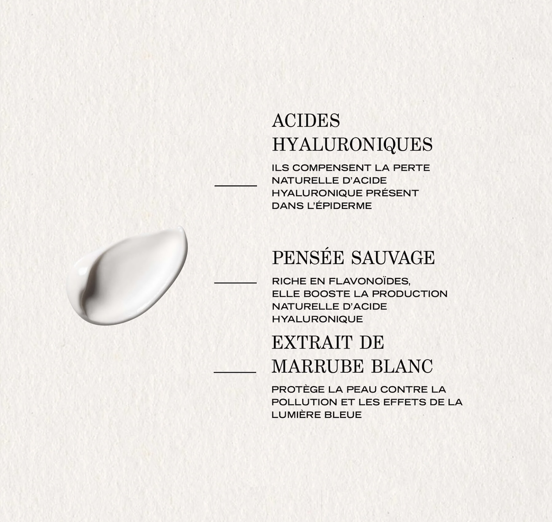 Crème de jour lissante à l’action corrective et préventive Cette crème de jour lissante (anti-rides) compense la perte naturelle de la peau en acide hyaluronique et booste sa production grâce à sa formule enrichie d’un complexe de plantes herboristes (extraits de Pin des Alpes reconnu pour protéger la peau du stress environnemental et flavonoïdes extraits de la Pensée Sauvage pour booster la production d’acide hyaluronique). À ce complexe de plantes s’ajoute un duo d'acides hyaluroniques de haut et bas poids moléculaire pour hydrater la peau tout au long de la journée. Résultat : La peau est lissée, hydratée, protégée de la lumière bleue et des agressions quotidiennes. Son plus : Sa texture ultra fondante qui rend l’application très agréable Quand l’utiliser ? Le matin juste après avoir appliqué votre sérum