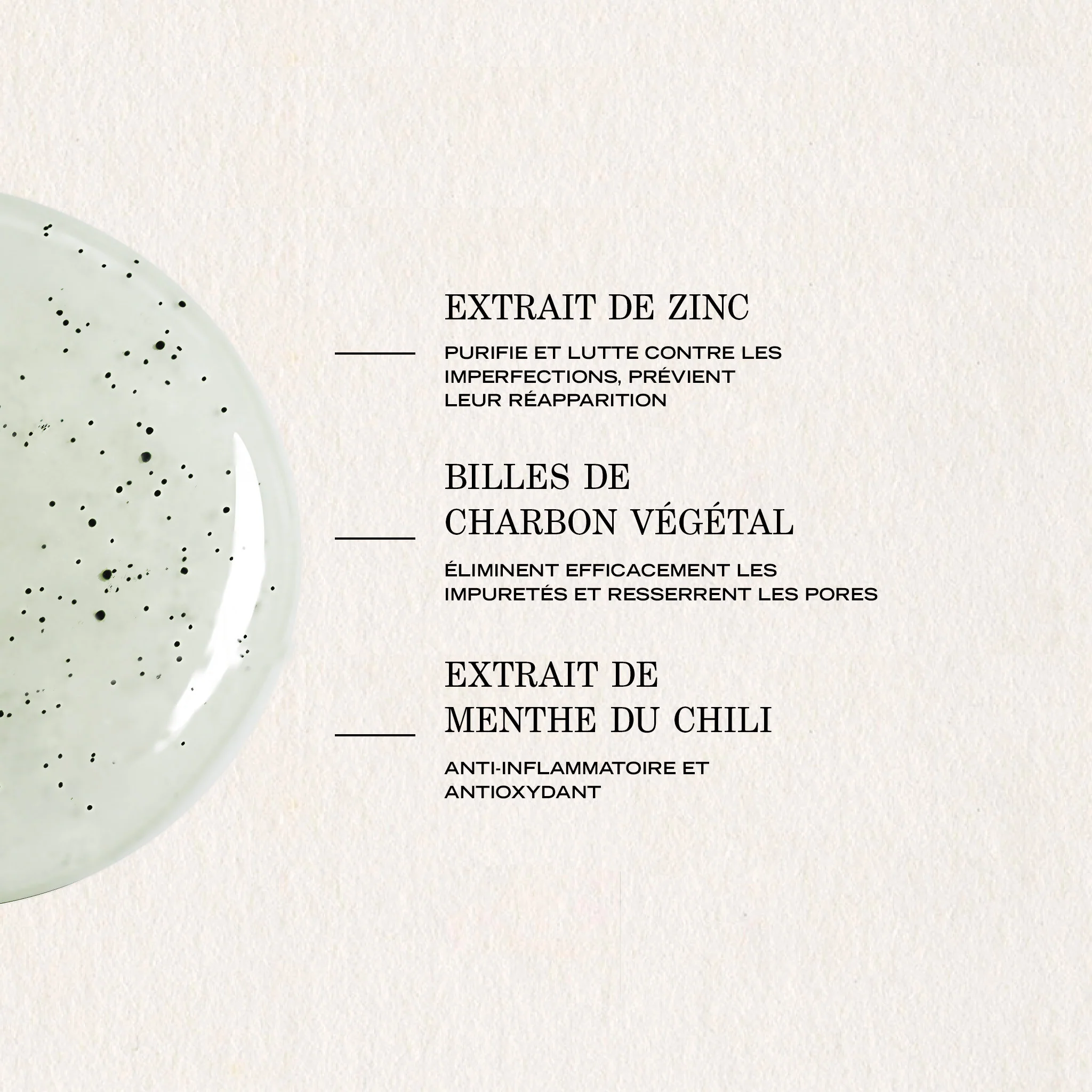 Gel moussant purifiant anti-imperfections NON COMÉDOGÈNE Utilisé quotidiennement, ce gel moussant purifiant nettoie et exfolie en douceur grâce à des microbilles fondantes au charbon végétal qui agissent comme un aimant pour retirer efficacement les impuretés. Sa formule est enrichie en zinc et en extrait de menthe du Chili, deux ingrédients reconnus pour leurs propriétés anti-imperfections. Elle resserre les pores, régule l'excès de sébum et limite l'apparition d'imperfections. Résultat : La peau est nettoyée, purifiée et le grain de peau est lissé. Son atout : Son parfum délicat de feuilles de menthe froissées et de rose. Quand l'utiliser ? Le soir, pour nettoyer la peau. En cas de maquillage, il est recommandé d'utiliser un soin démaquillant au préalable. Non comédogène.