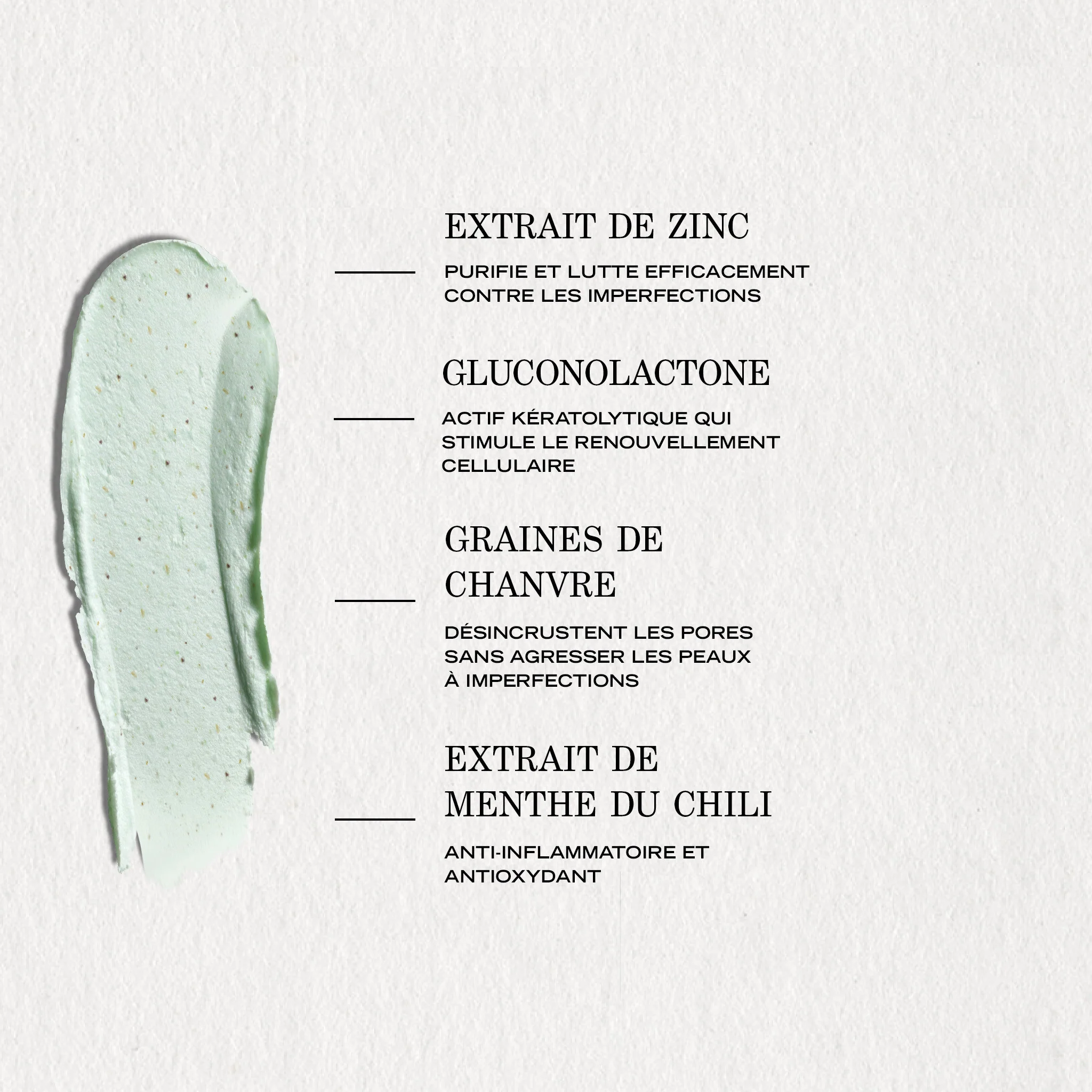 Le soin exfoliant des peaux à imperfections NON-COMÉDOGÈNE Découvrez le Stick Gommant Purifiant, un soin exfoliant conçu spécialement pour les peaux grasses à imperfections. Formulé avec des graines de chanvre et de la gluconolactone, il assure une double exfoliation douce, désincrustant les pores et éliminant cellules mortes et points noirs. Le zinc et l’extrait de menthe du Chili contribuent à purifier la peau, à limiter l'excès de sébum et à diminuer les imperfections. Résultat : Une peau purifiée, au grain affiné, avec moins de points noirs. Son atout : Sa texture crème onctueuse qui fond sur la peau pour un massage ultra-sensoriel, rendant l’exfoliation du visage plus simple grâce à son format stick. Quand l'utiliser ? Appliquez le matin ou le soir, une à deux fois par semaine, pour un soin optimal. Ce produit, pensé dans une démarche soucieuse de l'environnement, contient deux fois moins d'eau qu'un gommage traditionnel.