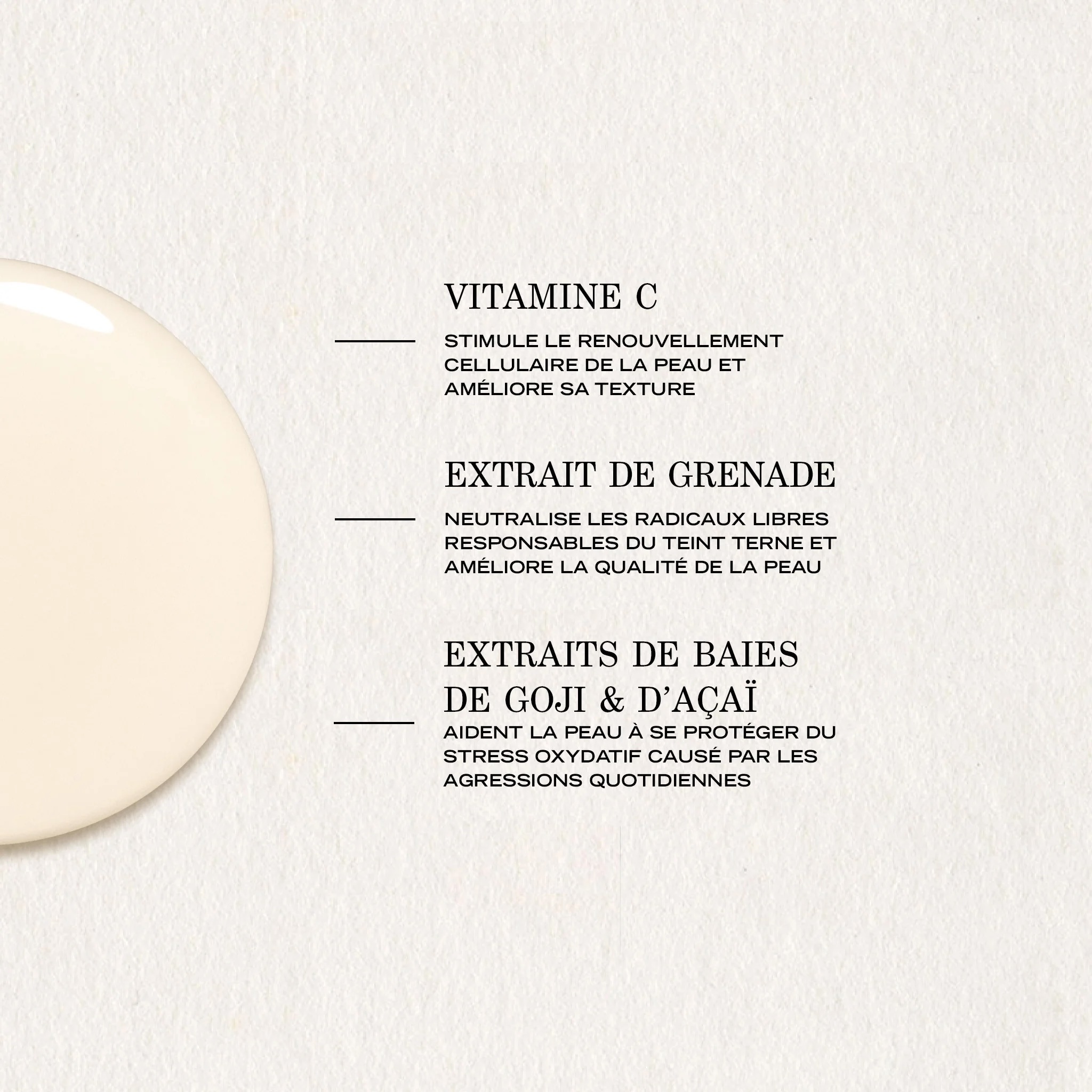 Le sérum coup d'éclat immédiat Concentré en vitamine C et en superfruits antioxydants (grenade BIO, goji BIO et açaï), ce sérum visage offre un coup d'éclat aux peaux ternes et fatiguées. Il unifie et affine le grain de peau pour un teint lumineux. Il aide à protéger la peau des agressions extérieures au cours de la journée. Jour après jour, ce sérum visage aide à estomper les taches pigmentaires et à raviver l'éclat des peaux ternes. Résultat : Le grain de peau est lissé et le teint est plus éclatant. Son plus : Sa texture fluide et vivifiante qui fusionne avec la peau et pénètre en un instant. La peau est prête à accueillir une crème hydratante. Quand l'utiliser ? Le matin et le soir sur peau propre juste avant votre crème hydratante habituelle. Composé à 95% d'ingrédients d'origine naturelle. clean* & vegan** *sans ingrédients controversés. **sans ingrédients d’origine animale