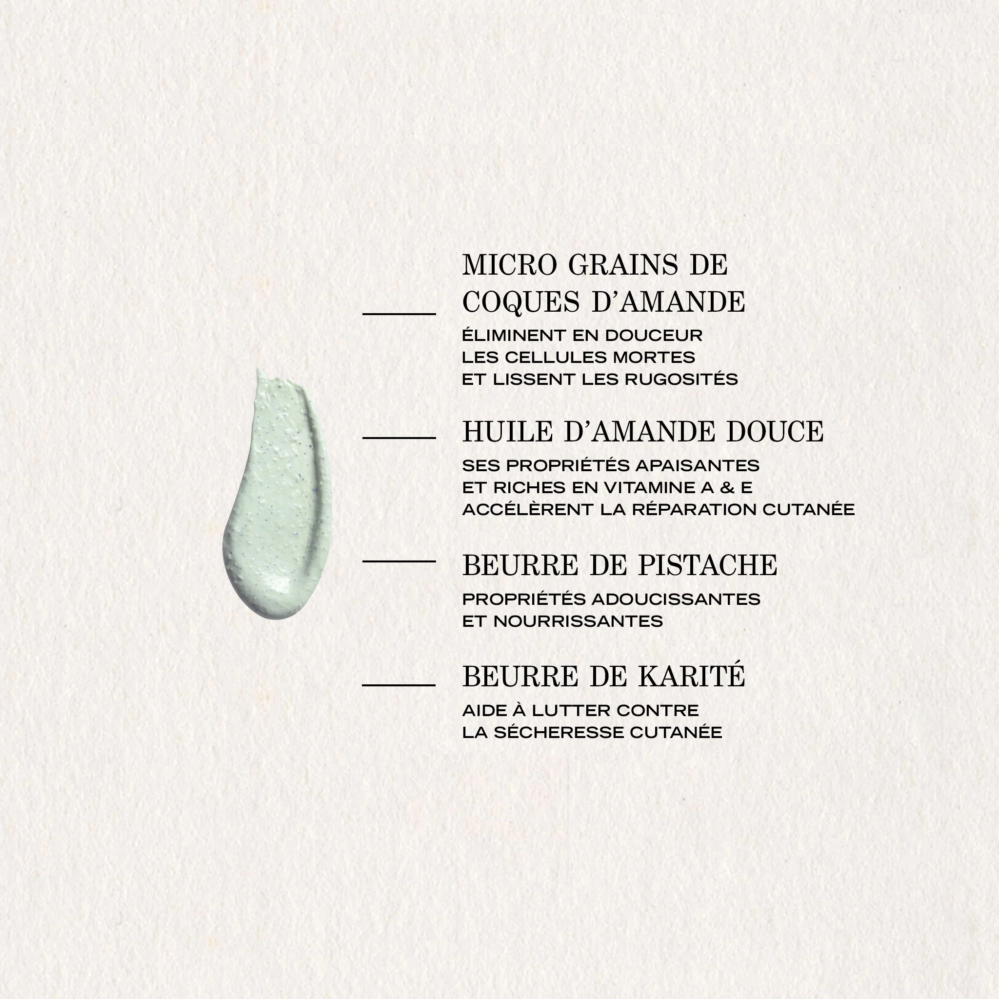 Gommage corps exfoliant Le Gommage Crème Fondant pour le corps est une délicieuse crème exfoliante, délicatement parfumée à l’amande douce. Les coques d’amande permettent une exfoliation douce, éliminant les cellules mortes et impuretés. Le grain de peau est lissé et la peau retrouve douceur et souplesse.